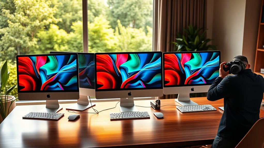 If you’re a power user working from home in 2025, I recommend considering the latest iMac models with the M4 chip, offering top-tier performance, stunning 4.5K displays, and seamless ecosystem integration. Look for options with at least 16GB of RAM and ample SSD storage to handle demanding tasks efficiently. These iMacs are sleek, powerful, and versatile—perfect for productivity and creative work. Keep exploring to find the best fit for your needs.