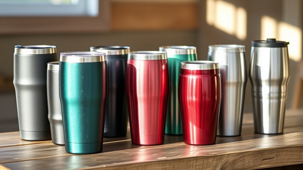 When selecting an insulated tumbler, considering material durability can make a significant difference in its longevity. High-quality 18/8 stainless steel is a top choice because it resists dents, rust, and corrosion, guaranteeing the tumbler lasts through daily use. Many durable models feature outer coatings like powder-coated or DuraCoat finishes, which boost scratch resistance and protect against wear. Double-wall vacuum insulation not only keeps drinks at the right temperature but also strengthens the structure, reducing cracks and leaks. Eco-friendly options often use recycled stainless steel, offering sustainability alongside durability. Additionally, well-constructed tumblers with seamless welding and reinforced rims can better withstand impacts and everyday stresses. These factors collectively ensure your tumbler remains functional and attractive for years to come.