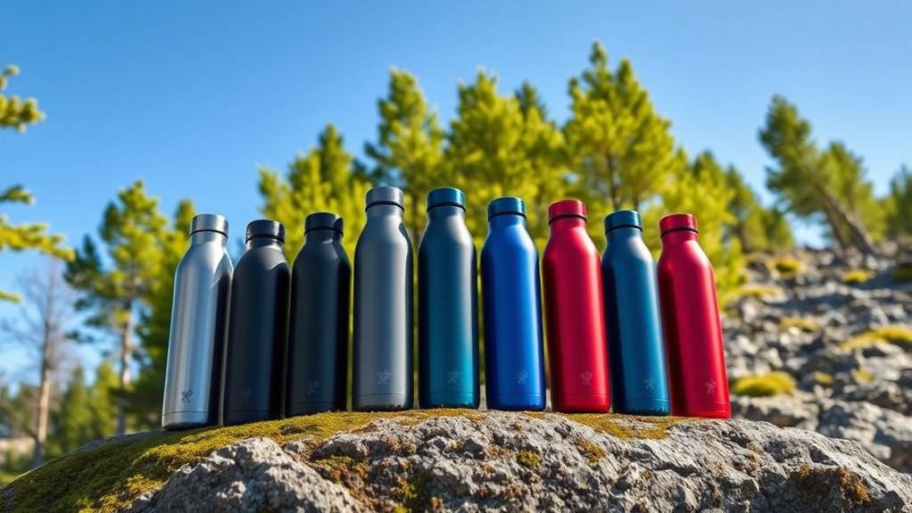 When it comes to hiking, durability is essential because your water bottle must withstand the rigors of outdoor adventures. I recommend choosing bottles made from high-quality, food-grade stainless steel like 18/8, which resists rust and corrosion. Look for reinforced construction features, such as copper-plated triple-wall vacuum insulation or thick multilayer walls, to handle impacts and rough terrain. A sturdy powder coating or textured finish helps resist scratches, chipping, and general wear over time. It’s also important to select bottles with durable, leak-proof lids and secure sealing mechanisms to prevent spills during vigorous activity. Additionally, reinforced handles, paracord attachments, or silicone boots offer extra protection and a reliable grip in rugged environments. These features ensure your water bottle remains resilient and functional on every adventure.