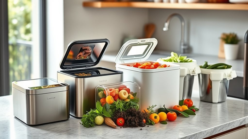 If you’re looking to turn kitchen waste into rich soil, I recommend exploring some of the best composters and food cyclers on the market. Options like the Food Cycler Eco 5, GEME Smart 19L, and compact models such as the Eco 3 combine efficiency, easy operation, and odor control. These units quickly convert scraps into compost or powder, saving space and reducing waste. Keep exploring to discover how they can help you make eco-friendly changes in your kitchen.