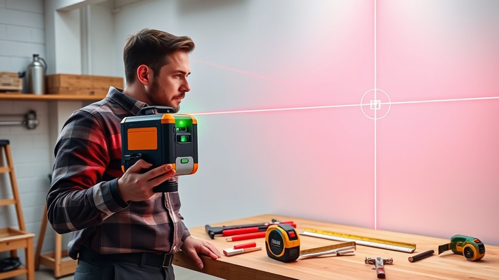 Self-leveling capabilities play a key role in ensuring your laser lines are consistently accurate and easy to work with. These levels automatically adjust to within 4° of horizontal or vertical, saving you the hassle of manual calibration. They typically use a pendulum mechanism that responds quickly to surface tilts, providing stable, precise lines. If the surface is uneven or out of range, the laser often signals this with an alert or flashing line, so you know when to reposition. Manual mode is also available, allowing you to lock lines at specific angles when needed. This feature considerably boosts efficiency by reducing setup time and minimizing errors caused by surface irregularities, making self-leveling laser levels a reliable choice for quick, accurate results.