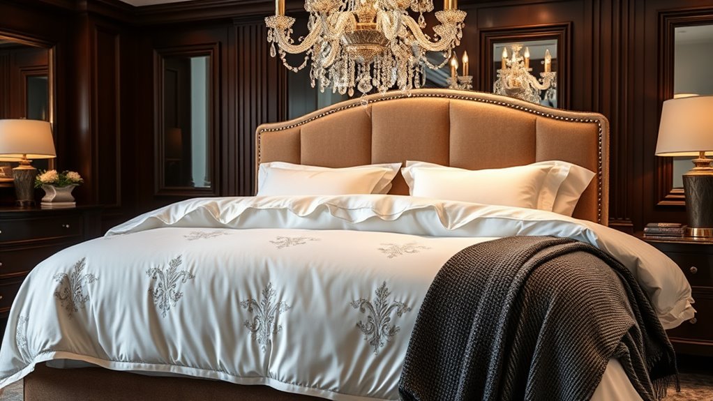 The design and aesthetic appeal of luxury bedding sets play a essential role in creating a sophisticated and inviting bedroom atmosphere. Intricate patterns, textures, and decorative details like embroidery or jacquard weaves instantly elevate the visual allure. When selecting a set, I consider color schemes that complement my bedroom decor—neutral tones, metallic accents, or rich jewel hues for a refined look. The style can range from sleek modern minimalism to ornate classic opulence, allowing me to personalize my space. Decorative pillows, shams, and bed skirts add layers of texture and contrast, enhancing overall appeal. Elegant touches such as piping, embroidery, and button closures further refine the set’s look, ensuring that my bedding not only feels luxurious but also exudes visual sophistication.
