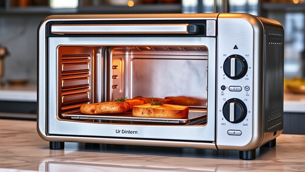 Have you ever noticed how a sleek, well-designed toaster oven can instantly elevate your kitchen’s look? Luxury models often feature modern, streamlined designs crafted from premium materials like stainless steel or brushed metal, giving them a sophisticated appearance. Many offer customizable color options and elegant accents that complement upscale decor. The attention to detail in their build quality guarantees they look refined and luxurious. Large, high-resolution digital displays and minimalistic control panels create a seamless, refined user experience. These appliances also emphasize compactness and space efficiency, blending form and function effortlessly. Overall, the design and aesthetics of these toaster ovens are carefully curated to enhance your kitchen’s style while providing a high-end, polished finish.