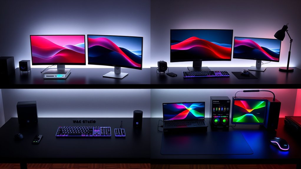 Based on the latest insights, the top Mac Studio setups in 2025 focus on high-end M4 Pro or M4 chips with 12-core CPUs, 32GB of RAM, and 4TB or more of fast SSD storage. These configurations excel at demanding tasks like video editing and 3D rendering, with multiple high-resolution display support. Prioritizing power, memory, and connectivity, these options offer exceptional performance. If you continue exploring, you’ll discover which setup suits your needs best and how to maximize your investment.