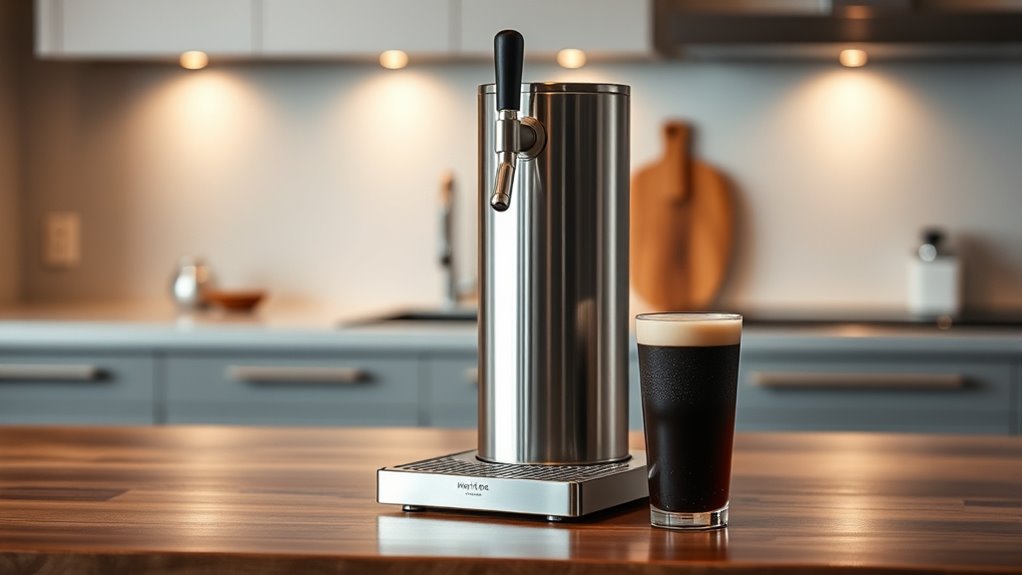 Selecting a nitro cold brew system that matches your comfort level and experience can make all the difference in enjoying your coffee at home. If you’re new to brewing, look for systems with automatic controls and clear instructions, which simplify the process. For more experienced users, manual options offer more control but may require extra effort. Prioritize user-friendly features like easy assembly, straightforward cleaning, and simple cartridge or nitrogen tank refilling to save time and reduce hassle. Accessible controls and easy dispensing mechanisms help ensure quick, consistent pours every time. Additionally, choose a system with solid customer support and troubleshooting resources, so you’re never left guessing. Ultimately, a system tailored to your skill level makes brewing enjoyable rather than frustrating.