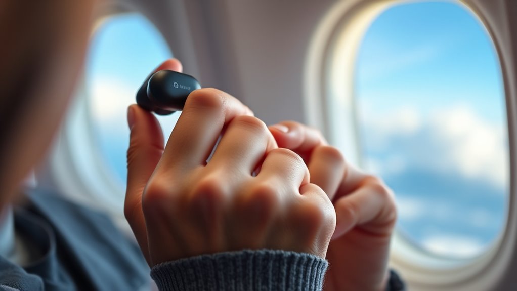 Choosing earbuds with effective noise cancellation is essential for a comfortable flight experience, and understanding how well they reduce ambient noise can make all the difference. To truly block out engine noise, look for earbuds that cut ambient sound by at least 20-30dB. Advanced hybrid noise cancelling technology, which uses microphones inside and outside the earbuds, detects and cancels a wider range of frequencies, enhancing performance. The best earbuds automatically adjust noise reduction levels based on your environment, ensuring consistent comfort. Keep in mind that fit and seal are crucial—poor sealing lets in noise, reducing effectiveness. Additionally, earbuds with multiple noise cancelling modes, like Quiet or Immersive, let you customize your experience, giving you better control over external sounds during your flight.