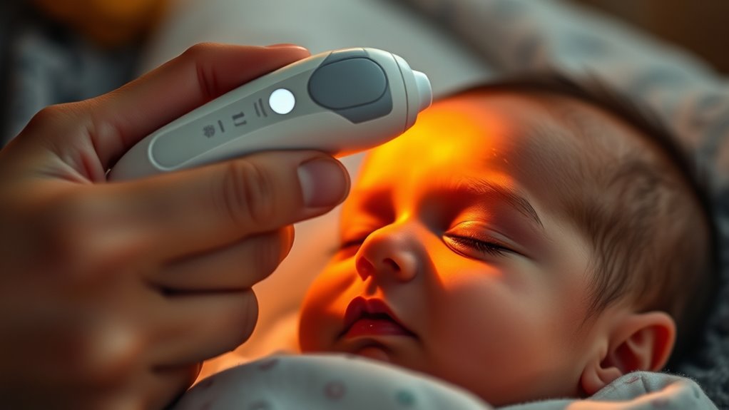 Are non-contact thermometers safe for newborns? Absolutely, I believe they are, as they’re gentle and don’t disturb delicate skin. I always recommend using a thermometer designed specifically for infants, following the manufacturer’s instructions carefully. They provide quick, accurate readings without touching your baby’s skin, making them a convenient choice. Just verify the device is calibrated correctly, and you’ll feel confident monitoring your newborn’s temperature safely and comfortably.
