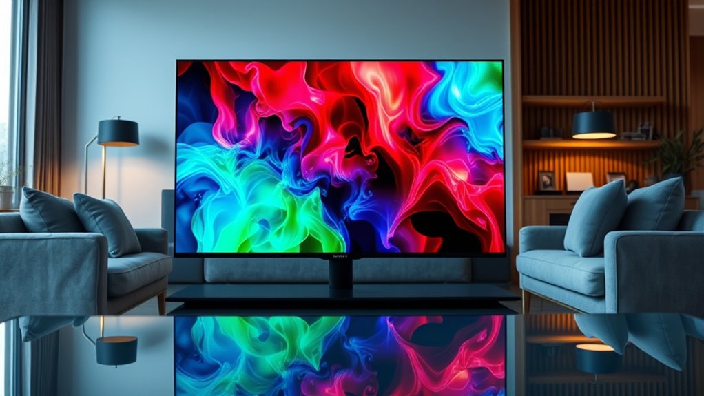 HDR and brightness play a pivotal role in elevating your OLED TV experience, especially during Cyber Monday deals where options abound. Higher HDR peak brightness levels create more vivid highlights and a more dynamic picture, making scenes pop with realism. Some models can reach over 1,000 nits, greatly boosting contrast and color accuracy in HDR content. This is vital for formats like Dolby Vision and HDR10+, which rely on sufficient brightness to deliver their full dynamic range. Advanced brightness technology also helps minimize glare and reflections, improving visibility in bright rooms. When choosing an OLED TV deal, prioritize models with high brightness capabilities to guarantee an immersive, striking HDR experience that truly enhances your viewing. Brightness is fundamental to bringing out the full potential of your OLED display.