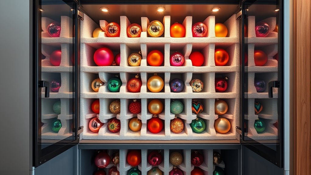 To guarantee ornaments survive accidental drops, adequate cushioning protection is essential. Foam inserts or padded compartments absorb shocks and prevent breakage during impacts. Soft linings like felt or foam padding cushion fragile ornaments from bumps and vibrations, reducing the risk of cracks. Dividers with added padding keep ornaments separated, minimizing scratches and collisions. Reinforced edges or corners on storage boxes further enhance drop-proofing by absorbing impact forces. Proper cushioning distributes shocks evenly across the container, lowering the chance of damage from accidental falls. When selecting storage boxes, look for those with built-in padding, shock-absorbing dividers, and reinforced edges. These features work together to protect your decorations, ensuring they stay safe and intact throughout storage and transport.
