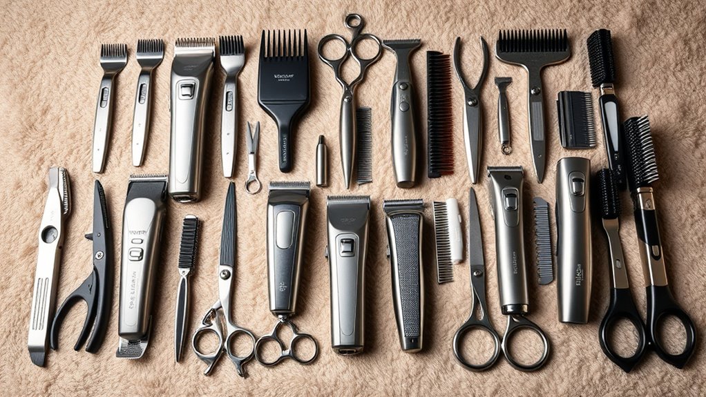 Choosing the right grooming kit starts with matching it to your pet’s specific type. You need to take into account whether you’re grooming a dog, cat, or smaller animal, as each requires different features. Check if the clippers are suitable for your pet’s coat length and thickness—heavy coats or long hair need more powerful blades for efficient grooming. Also, look for attachments or blades tailored to your pet’s breed or fur type, like fine blades for sensitive skin or thick blades for dense coats. Safety and gentleness are essential; guarantee the device is appropriate for your pet’s size and species, avoiding models with incompatible power levels. Additionally, pet-specific features like quiet operation can reduce stress, making grooming a more comfortable experience for your furry friend.