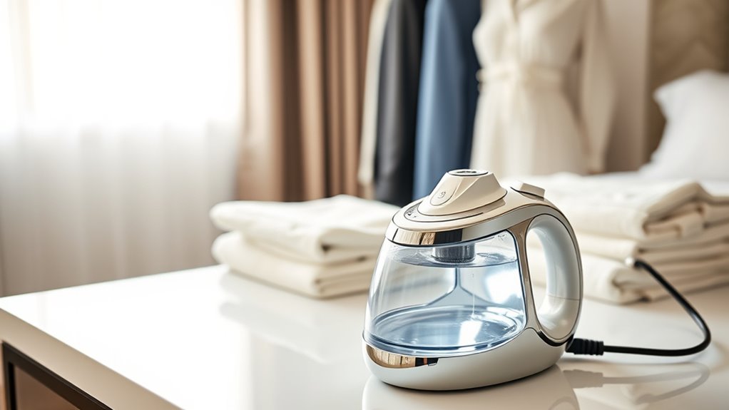 Size and weight are key considerations for travel steamers, but power and heating speed substantially influence how effectively and efficiently I can refresh my clothes on the go. A higher wattage, like 1000W or more, means faster heating and stronger steam, saving me time. Rapid heating speeds—often under 15 seconds—allow me to start steaming quickly, perfect for last-minute touch-ups. Reaching high temperatures, such as 320°F or above, ensures deep fiber penetration and better wrinkle removal. Models with quick heat-up times minimize downtime, so I can refresh garments between meetings or flights without delay. The combination of high power and rapid heating makes the steaming process more efficient, letting me maintain a wrinkle-free wardrobe even during tight travel schedules.