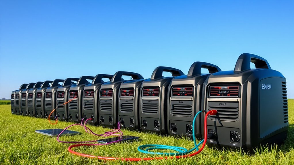 When selecting a portable inverter generator for sensitive electronics, it’s vital to verify it offers a variety of outlets and connectivity options. Multiple outlets, including standard 120V AC, USB ports, and DC outlets, guarantee you can connect various devices simultaneously. Look for USB ports supporting fast charging standards like QC3.0 or PD to quickly power smartphones and tablets. If you plan to use RV appliances or high-demand equipment, confirm the presence of RV-ready outlets such as TT-30R. Additionally, clean, stable power with low total harmonic distortion (THD) is essential for protecting sensitive electronics from surges and fluctuations. Finally, check if the generator supports parallel connection capabilities, allowing you to combine units for extra power while maintaining consistent, high-quality output.