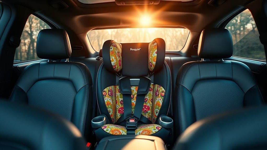 All-in-one car seats adapt as children grow by featuring adjustable headrests, harness heights, and recline positions. I love how they seamlessly shift from rear-facing to forward-facing and booster modes, guaranteeing a snug fit at every stage. This flexibility means I don’t have to buy new seats frequently. Plus, the easy-to-use adjustments make it simple to guarantee my child’s safety and comfort as they grow taller and heavier.