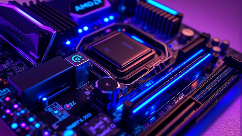 Effective thermal management is vital for maintaining ideal performance in gaming setups, especially with overclocked components and intensive workloads. Premium AMD motherboards feature large heatsinks, high-conductivity thermal pads, and heat pipes to efficiently dissipate heat from critical areas like VRMs and M.2 SSDs. Many incorporate active cooling solutions such as dedicated fans, extended heatsinks, and thermal guards to keep temperatures in check during demanding tasks. Proper thermal design prevents thermal throttling, ensuring consistent performance and system stability. Some high-end models even support integrated liquid cooling or custom cooling loops, boosting cooling capacity for overclocked CPUs and GPUs. Overall, effective thermal management not only enhances performance but also extends component lifespan and system reliability by avoiding overheating-related failures.