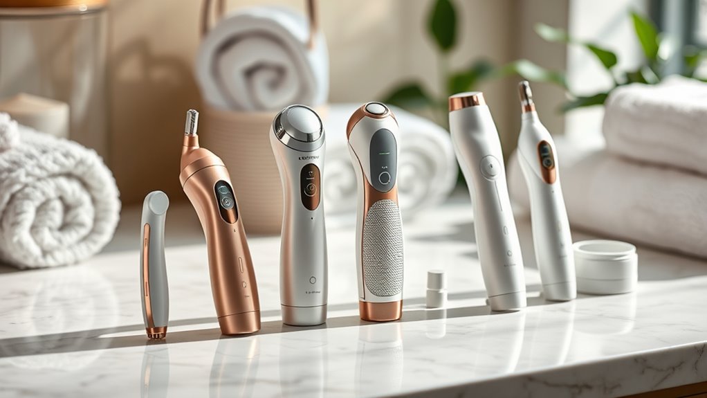If you’re looking for the best premium anti-aging facial devices that bring spa-quality results home, I’ve got you covered. These tools combine advanced features like LED light therapy, micro-current stimulation, heat, vibration, and cold therapy into sleek, portable designs. They target wrinkles, puffiness, and sagging while improving skin firmness and glow. With different modes and easy controls, they’re perfect for regular use. Keep exploring, and you’ll discover more about these innovative skincare solutions.