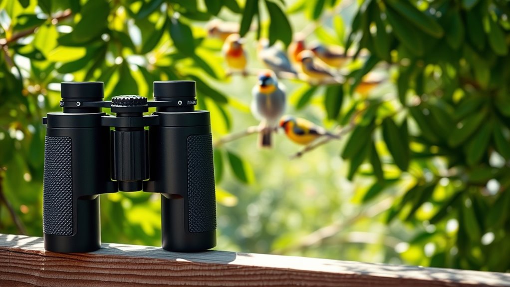 Optics coating quality plays a crucial role in determining the overall performance of premium binoculars for bird watching. High-quality binoculars feature fully multi-coated (FMC) or dielectric-coated lenses, which maximize light transmission and minimize reflections. These coatings improve brightness, contrast, and color fidelity, making distant details clearer. The use of BAK4 prisms with phase coatings further enhances image sharpness and contrast, especially in low-light conditions. Lens coatings also reduce glare and optical distortions, ensuring more accurate color reproduction and detailed views of elusive birds. The quality of these coatings directly impacts low-light performance and overall image clarity. When choosing binoculars, paying attention to coating quality guarantees you’ll get brighter, crisper images that elevate your birding experience, regardless of lighting conditions.