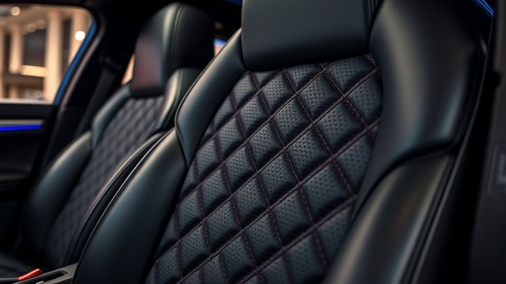 Choosing the right premium car seat covers involves more than just style and fit; comfort and breathability play a vital role in your driving experience. Breathable materials like mesh, leather, and microfiber allow air to circulate, reducing heat buildup and keeping you comfortable. Ventilation features, such as cooling mesh layers, help prevent sweating and maintain a cool seat during long drives. Contoured padding with ergonomic design supports proper posture and minimizes pressure points, enhancing overall comfort. Moisture-wicking fabrics draw sweat away from your body, keeping you dry and comfortable even on hot days. Proper breathability ensures your seat covers don’t trap heat or moisture, creating a fresher, more pleasant interior environment that makes every drive more enjoyable.