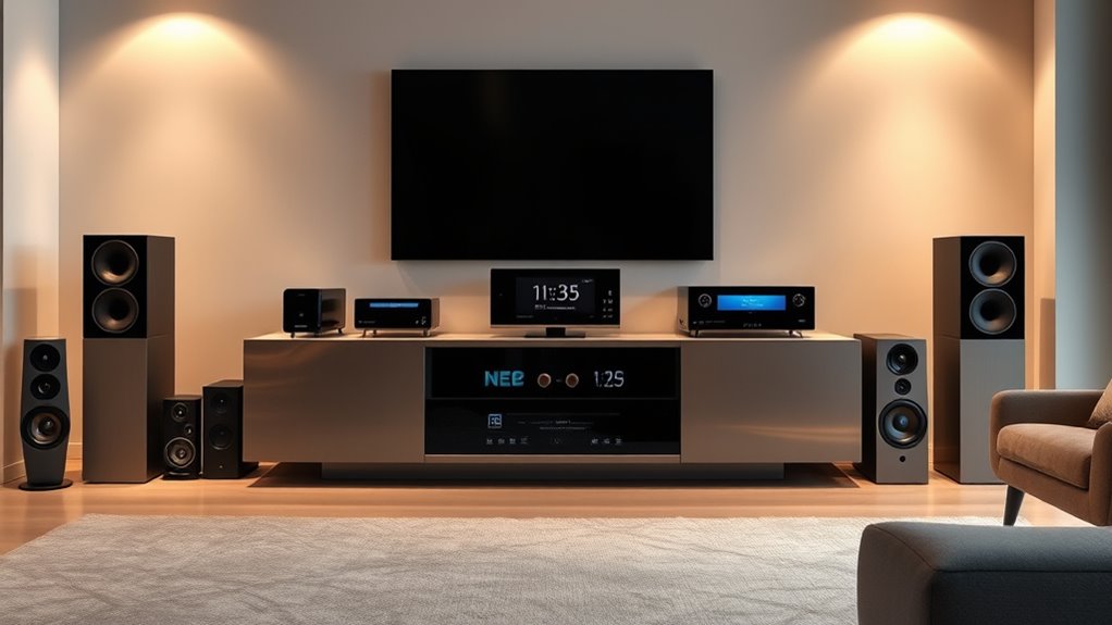 Imagine your smart home as a fortress, and the automation hub as its gatekeeper. I believe essential security features include robust encryption, multi-factor authentication, and real-time monitoring. These protect your data and devices from breaches. A high-end hub should also support automatic firmware updates and have secure cloud backups, ensuring your home stays both intelligent and safe, giving you peace of mind in every corner of your connected space.