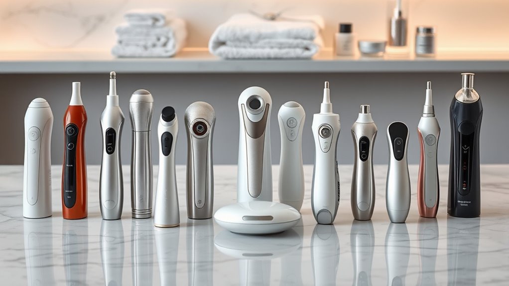 Selecting a microcurrent facial device that matches your skin type is essential to guarantee irritation and assure effective results. If you have sensitive skin, look for devices with adjustable intensity levels so you can customize treatments without discomfort. For oily or dry skin, verify the device uses gentle, low-level currents approved by dermatologists to reduce the risk of adverse reactions. Features like skin sensors or auto-shutoff can help tailor treatments and improve safety. It’s also important to review manufacturer guidelines on compatibility with skincare products like gels or serums, as these can enhance absorption and effectiveness. Choosing a device suited to your skin type not only minimizes irritation but also maximizes the benefits, helping you achieve spa-quality results safely at home.