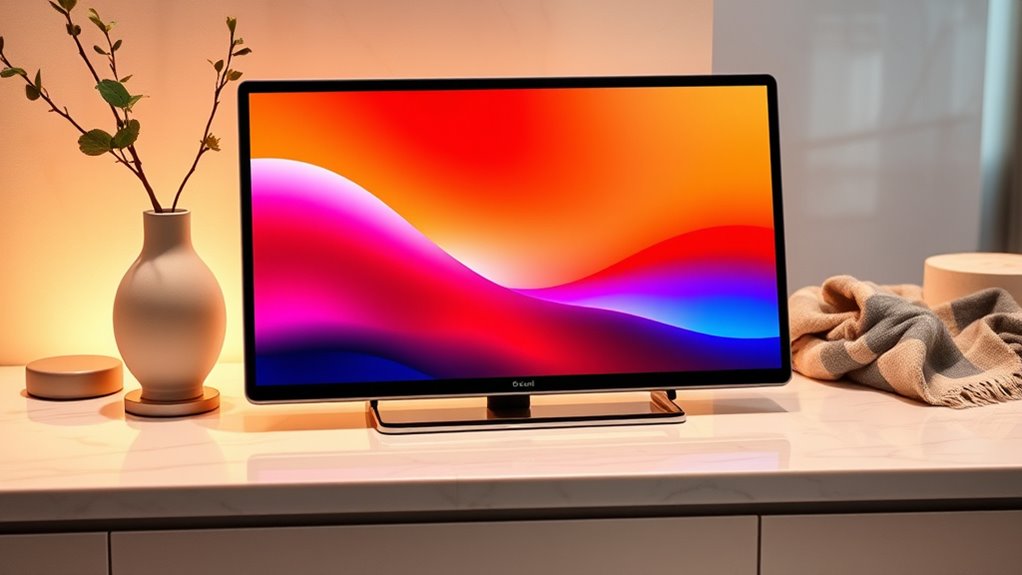 Choosing the right smart display means paying close attention to its design and aesthetics to guarantee it complements your home decor. Consider the device’s size, shape, and overall look to ensure it fits seamlessly into your space. Look for color options, materials like glass, plastic, or fabric, and finishes that match your personal style. The display quality, including resolution and screen size, should be visually appealing and functional. Pay attention to design details such as bezel thickness, button placement, and ease of access, which contribute to a sleek, modern appearance. Additionally, opt for environmentally friendly materials and sustainable packaging if eco-consciousness matters to you. A well-designed smart display enhances your space while providing a stylish, cohesive look.