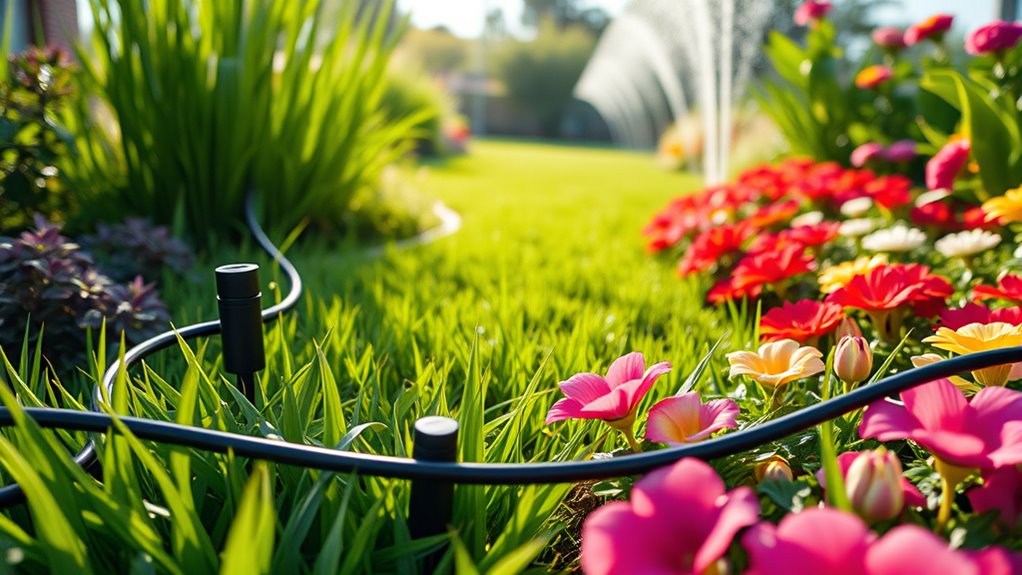 Smart irrigation systems conserve water effectively by using sensors and weather data to adjust watering schedules automatically. I love how they detect soil moisture levels and only water when necessary, preventing overwatering. Plus, integration with weather forecasts means they skip watering on rainy days. This smart technology guarantees my garden gets just the right amount of water, saving resources and keeping my plants healthy without wasting a drop.