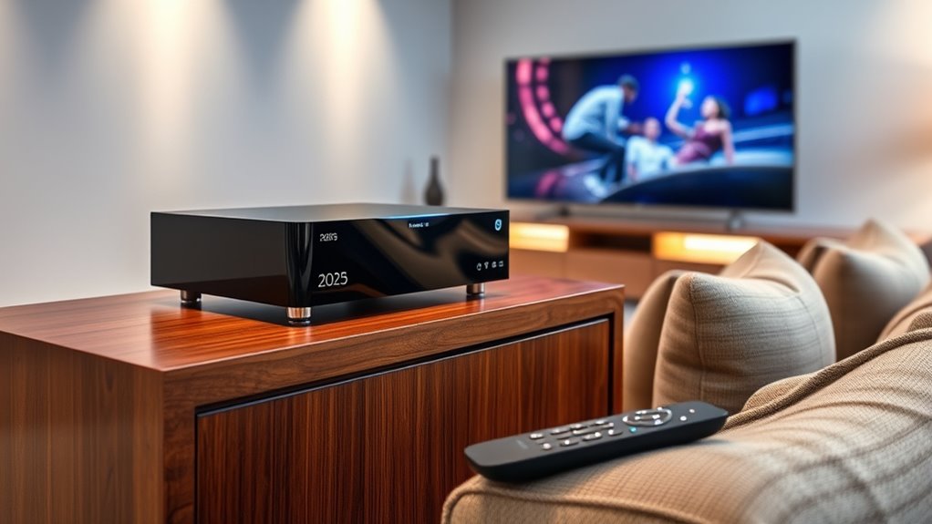 Choosing a premium streaming media player means paying close attention to video resolution quality, as it directly impacts your viewing experience. 4K resolution offers four times the pixel count of Full HD, resulting in sharper, more detailed images that make watching feel immersive. HDR technology enhances color accuracy, contrast, and brightness, creating vivid, realistic visuals. Support for Dolby Vision and HDR10+ enables devices to deliver dynamic, scene-by-scene HDR content, elevating picture quality further. Higher resolution supports larger screens and immersive setups without sacrificing clarity or detail. Ensuring your streaming device includes 4K and HDR capabilities means you’re future-proofed for the latest content formats, providing a premium and visually stunning experience that truly stands out in 2025.
