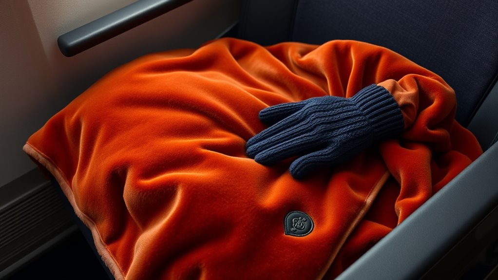 Adding thoughtful travel features to a premium blanket can considerably enhance your comfort and convenience on long flights. Built-in pillows, luggage straps, and clips make portability effortless, so your blanket stays with you. Many designs offer multi-functional elements like transforming into pillows or hiding valuables in discreet pockets, adding practicality. Features like machine-washable fabrics and quick-dry materials help maintain hygiene and ease cleaning during frequent travel. Including accessories such as sleep masks, earplugs, or storage pouches can boost your comfort and organization. Extra features like water-resistant fabrics or antibacterial coatings improve durability and hygiene, ensuring your blanket remains fresh and functional in various travel conditions. These added elements can truly elevate your overall travel experience, making long journeys more enjoyable and hassle-free.