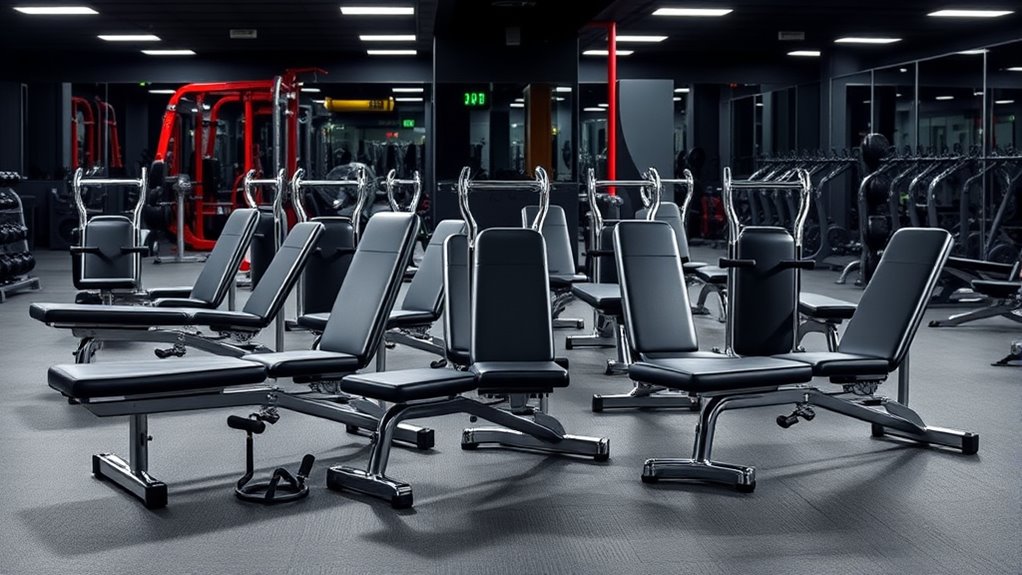 Maximizing space is vital when selecting a premium weight bench, especially if my home gym has limited room. Foldable benches that reduce their size by up to 80% are perfect for small or shared spaces. Features like foldable frames, removable components, and vertical storage make it easier to keep the area organized and clutter-free. The lightweight yet sturdy construction allows me to move and reposition the bench effortlessly, which is essential in tight spaces. Multi-function foldable benches enable a variety of exercises without needing extra equipment, saving even more room. Effective space management with these designs not only keeps my workout area tidy but also boosts safety and motivation by creating a clean, open environment.