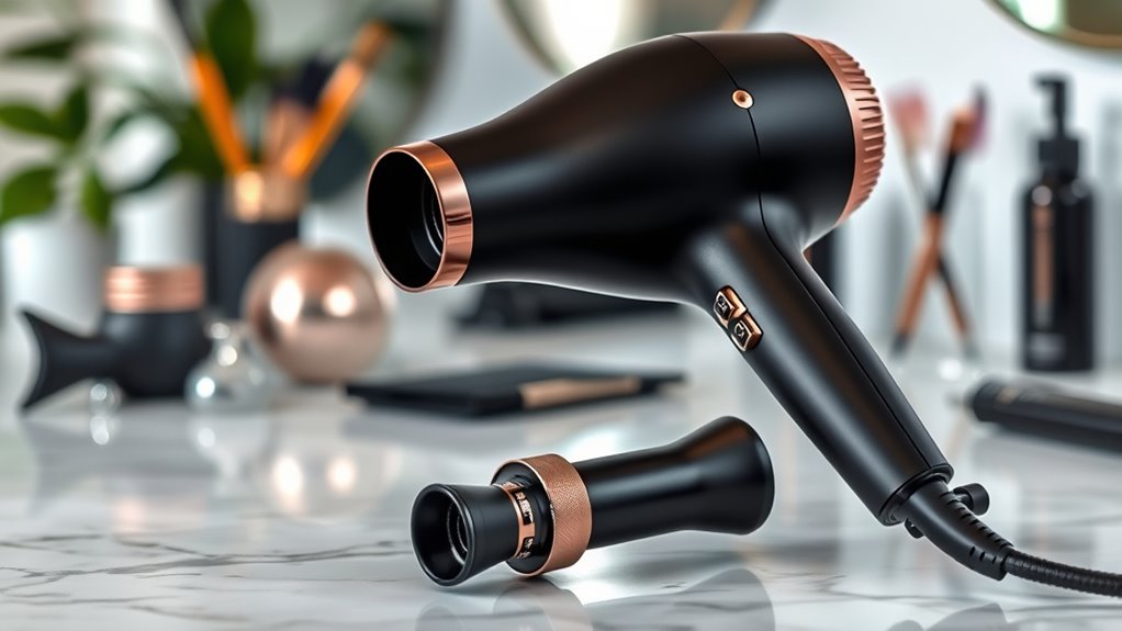 Think of attachments like diffusers as your secret weapons, much like a painter’s brushes. They help shape and enhance your style, especially for curly or textured hair. Using a diffuser gently boosts volume and maintains natural curl patterns while preventing frizz. It distributes heat evenly, so your hair dries uniformly without damage. With the right attachment, you can achieve salon-quality results at home, tailored perfectly to your hair type and style.