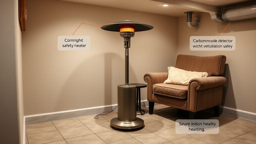 Looking for the best safe indoor propane heaters for your basement? I suggest considering models like the 18,000 BTU Big Buddy PRO Series, ProCom ML300TBA-B Ventless Heater, and portable options like the 9,000 BTU Buddy Radiant Heater, which combine safety features with reliable heat. Many of these units include tip-over switches, oxygen sensors, and certifications to keep you secure while warming your space. Keep going, and I’ll share more details to help you find the perfect fit.