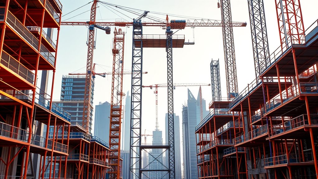 Selecting scaffolding that offers solid stability and support is essential for a safe and efficient construction process. I always check the load capacity and weight limits to guarantee the structure won’t collapse under expected loads. A sturdy frame made from heavy-duty materials like steel or aluminum provides reliable support and minimizes wobbling. Lockable caster wheels and outriggers improve mobility without sacrificing stability, which is crucial on dynamic sites. Adjustable platform heights and levelers help compensate for uneven surfaces, maintaining consistent support at any height. Proper assembly, following manufacturer guidelines, is vital to maximize stability and safety. When I prioritize these factors, I ensure a safer working environment and a more reliable scaffold system that withstands the demands of construction projects.