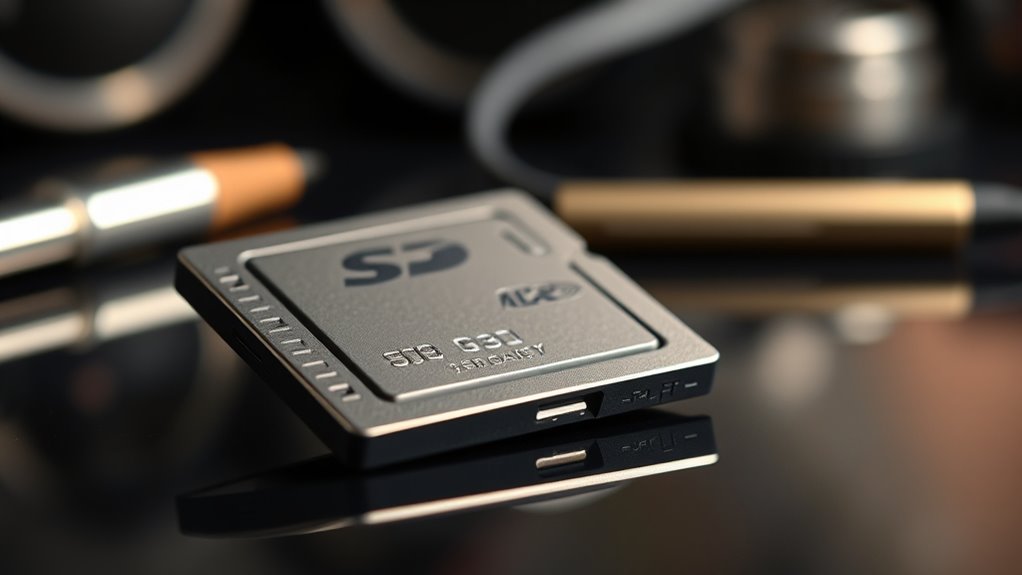 Choosing the right SD card hinges on understanding its speed class ratings, which indicate the minimum data transfer speeds essential for smooth recording and playback. UHS Speed Class ratings like U1 and U3 specify minimum speeds of 10MB/s and 30MB/s, respectively, ensuring reliable handling of high-resolution video. Video Speed Class ratings—V30, V60, and V90—represent the minimum sustained write speeds needed for 4K, higher resolutions, and 8K video recording, with V90 supporting the most demanding tasks. While Class 10 guarantees 10MB/s, it may fall short for high-quality video. Selecting a card with appropriate speed ratings aligned with your device’s requirements guarantees seamless performance, prevents dropped frames, and ensures data integrity during intensive recording sessions.