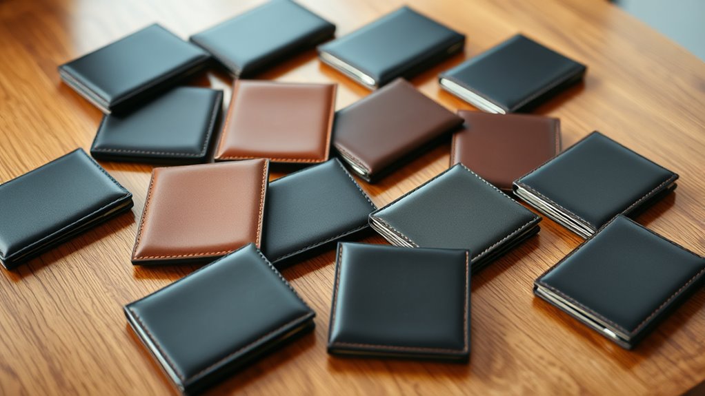 Beyond RFID-blocking materials, there are several additional security features to contemplate when choosing a slim wallet. I look for wallets with physical security measures like zippers, clasps, or reinforced compartments that can deter pickpocketing. Many wallets incorporate RFID shielding layers made from specialized metals or composites that block signals at 13.56 MHz and higher, protecting my contactless card information. Some designs feature RFID-proof sleeves or pockets that isolate RFID chips from scanners. Anti-skimming features, such as metal linings or blocking layers, add an extra barrier against unauthorized wireless data collection. Discreet storage options and hidden compartments are also valuable, making it harder for thieves to access multiple cards or cash at once. These security layers give me peace of mind beyond just RFID protection.