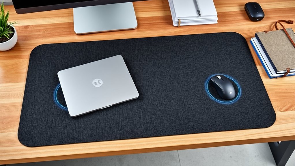 If you’re looking to organize your workspace with style and functionality, I recommend exploring the 15 best smart desk mats with wireless charging. These mats come in various sizes, materials, and features like anti-slip bases, waterproof surfaces, and RGB lighting. Many support fast charging for your phone and earbuds, keeping cables to a minimum. To find the perfect match for your desk, check out the details that suit your needs—you’ll discover more options and tips along the way.