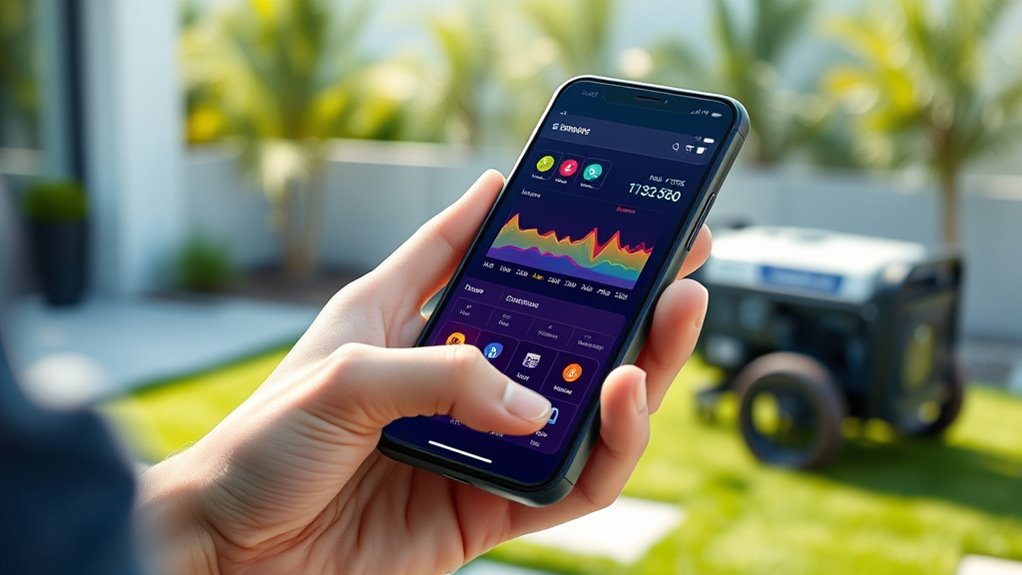 Integrating a smart generator remote monitoring app with your existing smart home ecosystem can considerably streamline your energy management. I look for apps that seamlessly connect with ecosystems like Alexa, Google Home, or Zigbee, allowing centralized control. Compatibility with voice assistants is a huge plus, enabling me to monitor and control my generator with simple voice commands. Automation routines are also essential—they let me set triggers, like starting or stopping the generator based on environmental conditions or energy needs. The app should offer easy device pairing and straightforward configuration within my smart home app, ensuring everything works together smoothly. Finally, integration with other smart devices, such as energy meters and sensors, helps me manage my home’s energy consumption holistically, making the whole system more efficient and user-friendly.