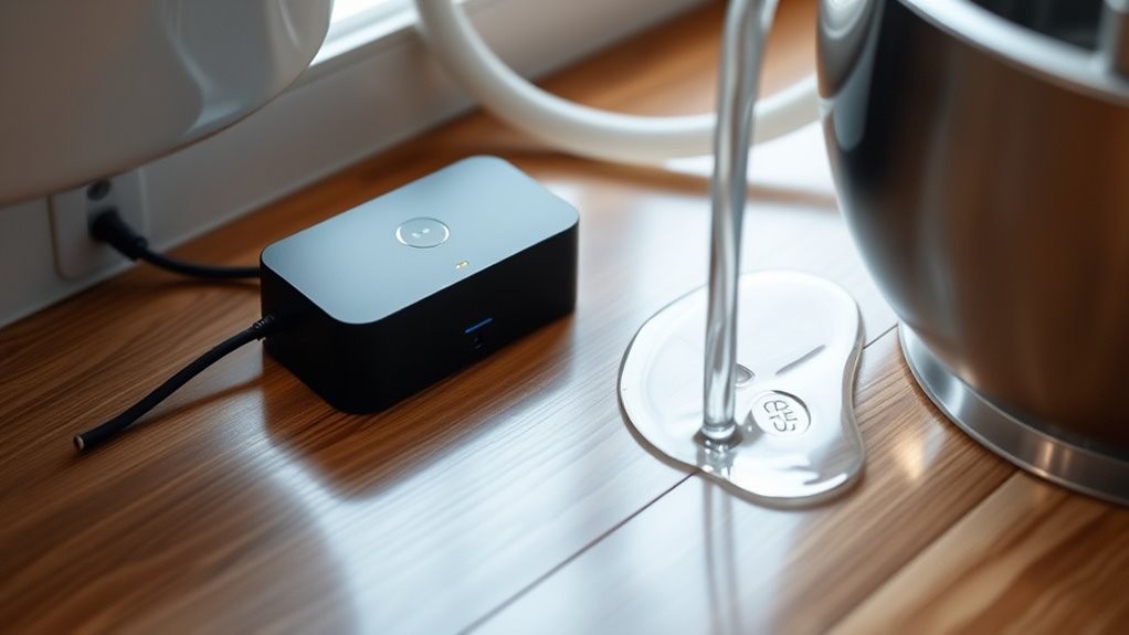 Ever wondered how to guarantee your water leak detector keeps working perfectly in challenging conditions? The key is choosing one that’s waterproof or weatherproof. A waterproof detector rated IP67 or higher can handle immersion in water and resist dust, ensuring it stays functional even if submerged or exposed to spills. Weatherproof models are designed for outdoor use, enduring rain, humidity, and temperature changes without faltering. This durability is vital if you plan to install the device outside near gardens, pipes, or damp basements. Proper sealing and a durable casing are essential to maintain protection over time. By selecting a detector with these features, you ensure reliable operation regardless of environmental challenges, giving you peace of mind that your home remains protected from leaks and floods.