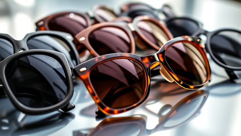Opting for sunglasses with high-quality lens materials is essential because these materials directly impact UV protection and durability. Materials like TAC, polycarbonate, and glass provide superior UV filtering and impact resistance, ensuring your eyes stay protected in various conditions. Polarized lenses made from premium materials substantially reduce glare and improve clarity, especially in bright environments. Durable lenses resist scratches, preserving their protective qualities over time and maintaining optical clarity. High-grade materials also support UV400 ratings, blocking nearly all UVA and UVB rays for thorough safety. Additionally, the quality of the lens material influences how well the sunglasses preserve color accuracy and prevent distortion over extended use. Choosing the right lens material ensures your sunglasses are both effective in UV protection and long-lasting.