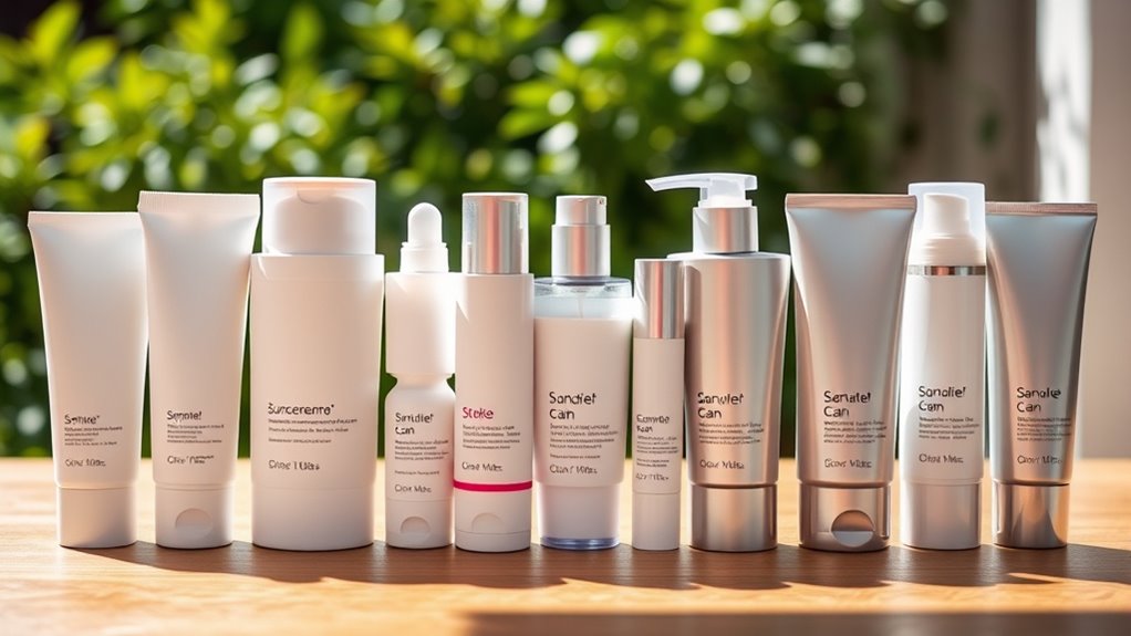 Selecting a sunscreen that suits your skin is essential for effective protection without irritation. I recommend choosing non-comedogenic formulas to prevent pore clogging, especially if you’re prone to acne. For sensitive skin, opt for fragrance-free and hypoallergenic options to minimize irritation. Mineral sunscreens containing zinc oxide or titanium dioxide are usually gentler and suitable for delicate skin types. It’s also important to match the product to your skin type: gels or water-based formulas work well for oily skin, while creams or lotions suit dry skin better. Always review ingredient lists carefully to avoid potential allergens or irritants that could trigger reactions. By considering these factors, you can select a sunscreen that not only protects but also respects your skin’s unique needs.