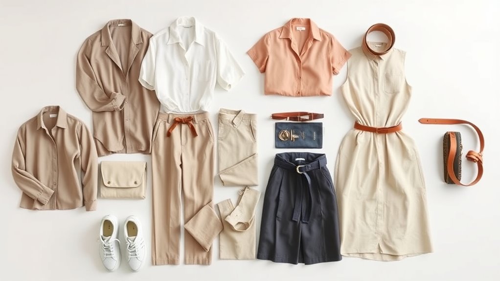 Choosing versatile travel capsule wardrobe pieces means selecting items that can be styled in multiple ways, allowing for a variety of looks without overpacking. I look for tops that can be dressed up or down and bottoms that easily pair with different tops for diverse outfits. Neutral colors and classic designs help maximize mix-and-match options, making packing more efficient. I prefer fabrics like stretch cotton or silk blends that adapt well to various occasions and seasons, ensuring comfort and durability. Separates that can be layered or worn alone make progressing between casual, formal, and active settings seamless. Additionally, I prioritize pieces with adjustable features, such as drawstrings or removable elements, so I can customize fits and styles depending on my travel scenario. This approach keeps my wardrobe flexible and functional.