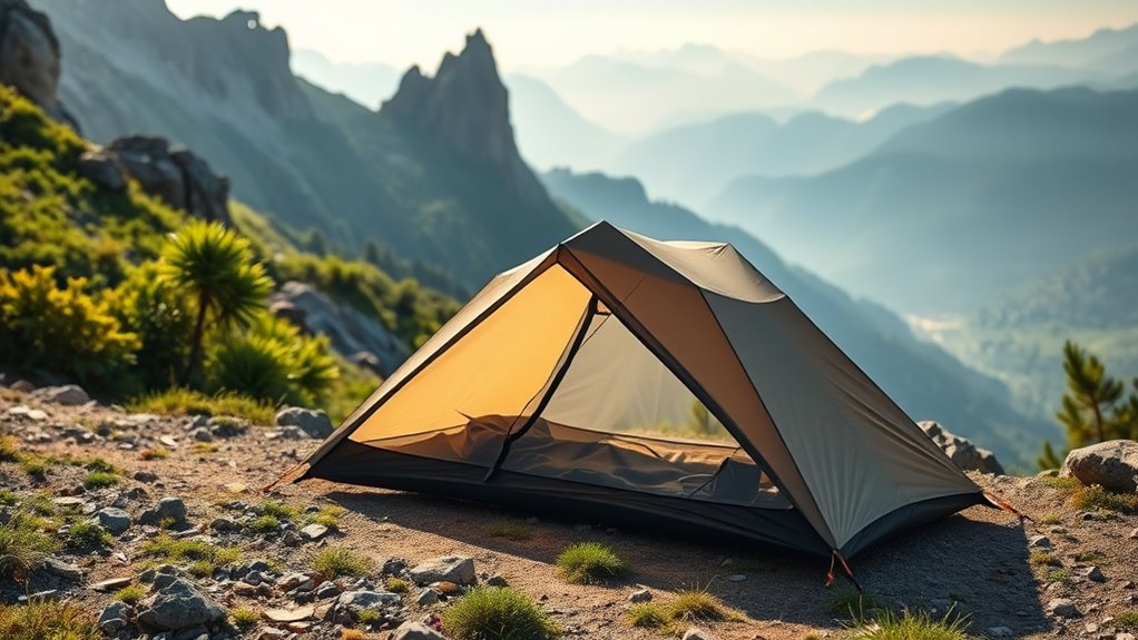 When choosing an ultralight camping tent, prioritizing good ventilation is essential for comfort and safety. Features like mesh panels, windows, and multiple vents promote airflow, helping to reduce condensation and keep the interior dry. Proper ventilation also maintains a cooler environment during warm weather and prevents stuffiness, making your campsite more comfortable. Double-layer designs with mesh inner tents and rainflies allow for adjustable airflow based on weather, enhancing overall comfort. Good ventilation also helps manage humidity levels, which reduces the risk of mold and mildew. The placement and size of vents and mesh openings are vital—they directly impact how well the tent breathes and how pleasant it feels inside. A well-ventilated tent makes your outdoor experience much more enjoyable.