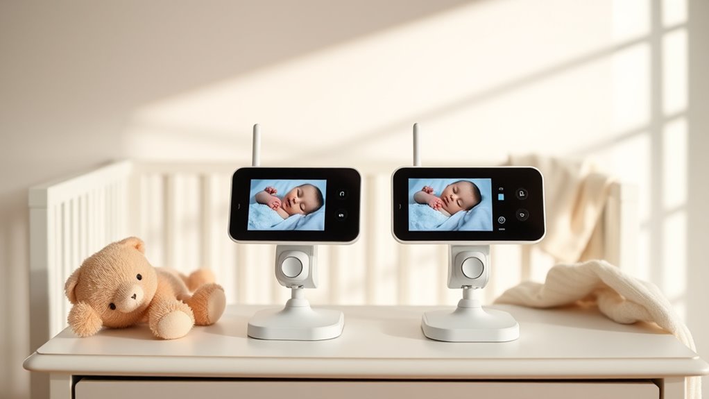 When selecting a video baby monitor with dual cameras, it’s essential to evaluate the monitoring range and signal stability to guarantee continuous coverage throughout your home or yard. Look for a monitor with a transmission range of up to 1,000 feet outdoors or 150-1,500 feet indoors, ensuring you can keep an eye on your baby from different areas. Verify that the signal uses secure, interference-free technology like FHSS or digital encryption to prevent hacking or disruptions. Choose monitors with dual cameras that support independent or synchronized feeds over a reliable connection, maintaining consistent video quality. Additionally, opt for a monitor operating on dedicated protocols such as 2.4GHz FHSS or 5GHz WiFi, which minimizes interference from household devices, ensuring stable signal strength in various environments.