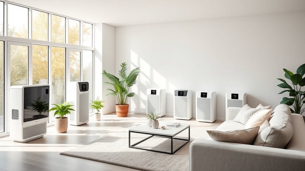 If you’re looking for the best whole-house air purifiers for allergies in 2025, I’ve found top models that cover large spaces and effectively remove pollen, pet hair, smoke, and odors. Many feature HEPA filters, smart sensors, and quiet operation. Units like WINIX 5520, LEVOIT’s large room models, and premium brands like BLUEAIR stand out for their efficiency and smart controls. Keep going, and you’ll discover detailed options to help you breathe easier at home.