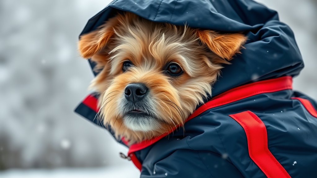 Selecting a waterproof winter dog jacket requires attention to the durability of its materials and waterproofing features to guarantee it withstands harsh weather conditions. I look for fabrics like polyester, nylon, or coated materials because they provide long-lasting protection against rain, snow, and slush. Waterproofing is often achieved through membranes or coatings such as polyurethane or DWR, which prevent water from seeping in. Reinforced seams and sealed stitching are vital to keep leaks out and maintain waterproof integrity over time. I also prioritize jackets with adjustable closures and secure zippers, as they reduce gaps where water could enter. Additionally, breathability is essential to prevent moisture buildup inside, ensuring my pup stays dry and comfortable without overheating.