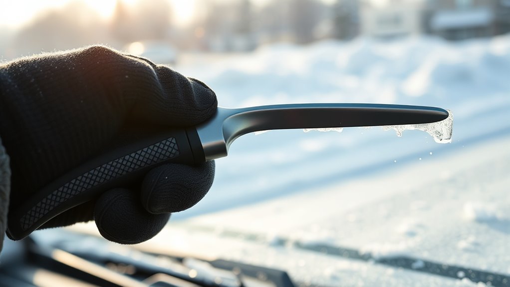 Selecting a windshield de-icer tool that’s easy to handle can make a big difference on cold mornings. I look for tools with ergonomic, non-slip handles to guarantee I maintain a secure grip, even when wearing gloves. Lightweight tools help reduce fatigue during extended use, making the task less tiring. I prefer models with simple, easy-to-operate mechanisms like push or spray functions, which streamline application and save time. Multi-functional tools that combine scraping, melting, and breaking features are especially useful, allowing me to handle different ice situations without switching devices. Additionally, I pay attention to the design, making sure I can switch between tasks quickly without fiddling with complicated adjustments. This focus on ease of use makes icy mornings much safer and less stressful.